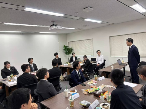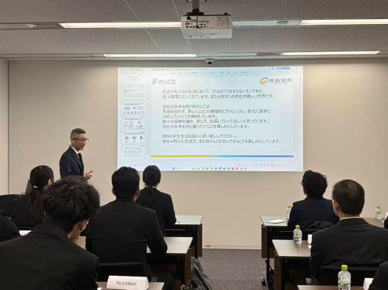 式典の冒頭では、専務より会社紹介とともに、内定者の皆さんへの温かな歓迎のメッセージが贈られました。新入社員への期待と激励が込められた言葉に、内定